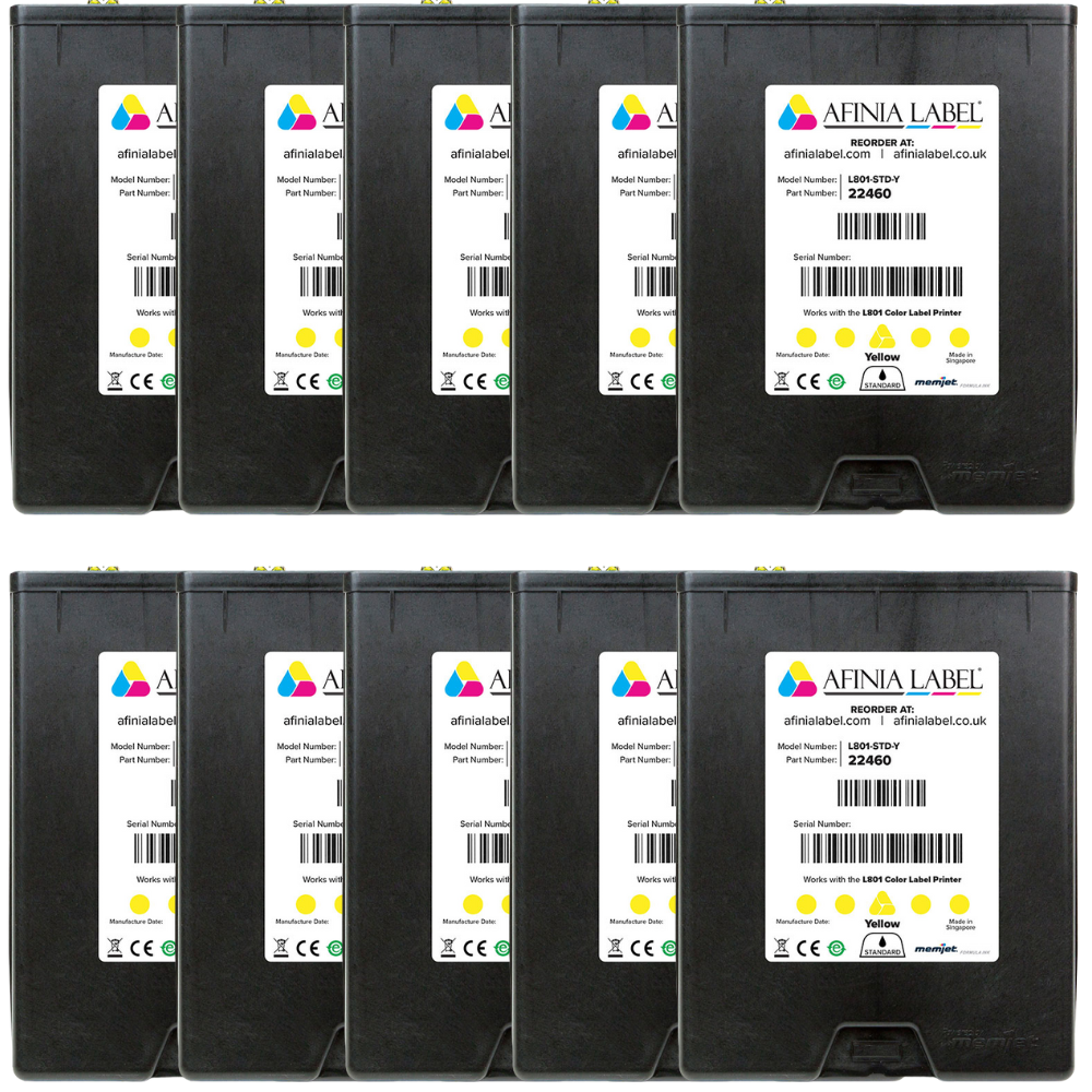 Das Afinia L801 Set Tintenkartuschen 10er, Gelb bringt Strahlkraft und Effizienz auf Ihre Etiketten – Tag für Tag, Ausdruck für Ausdruck.
